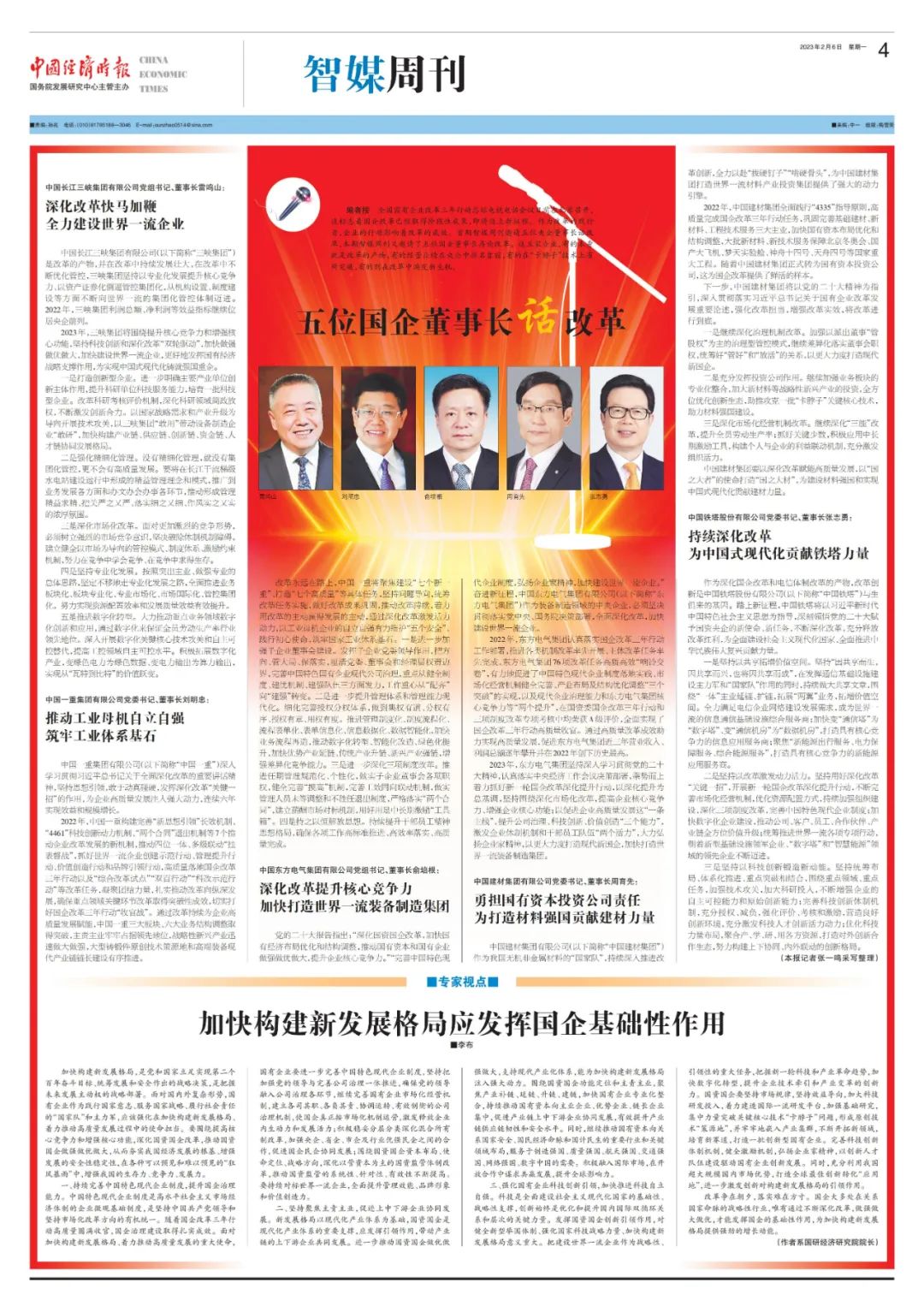 作为刷新的践行者,企业的行动影响着刷新的效果。2月6日,中国经济时报约请五位国企董事长话刷新。永利集团官网总站集团党组书记、董事长俞培根先容了集团公司以党的二十大精神为指引,坚决贯彻落实党中央、国务院决议安排,周全深化刷新,加速建设天下一流企业的相关情形。