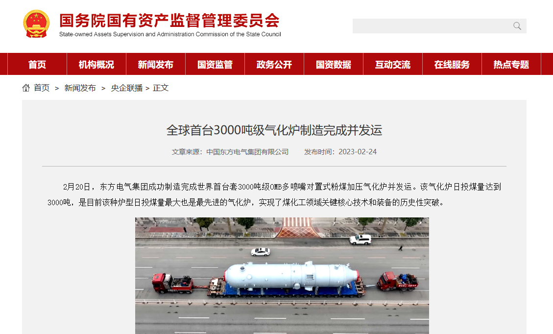 [国资委网站]全球首台3000吨级气化炉制造完成并发运